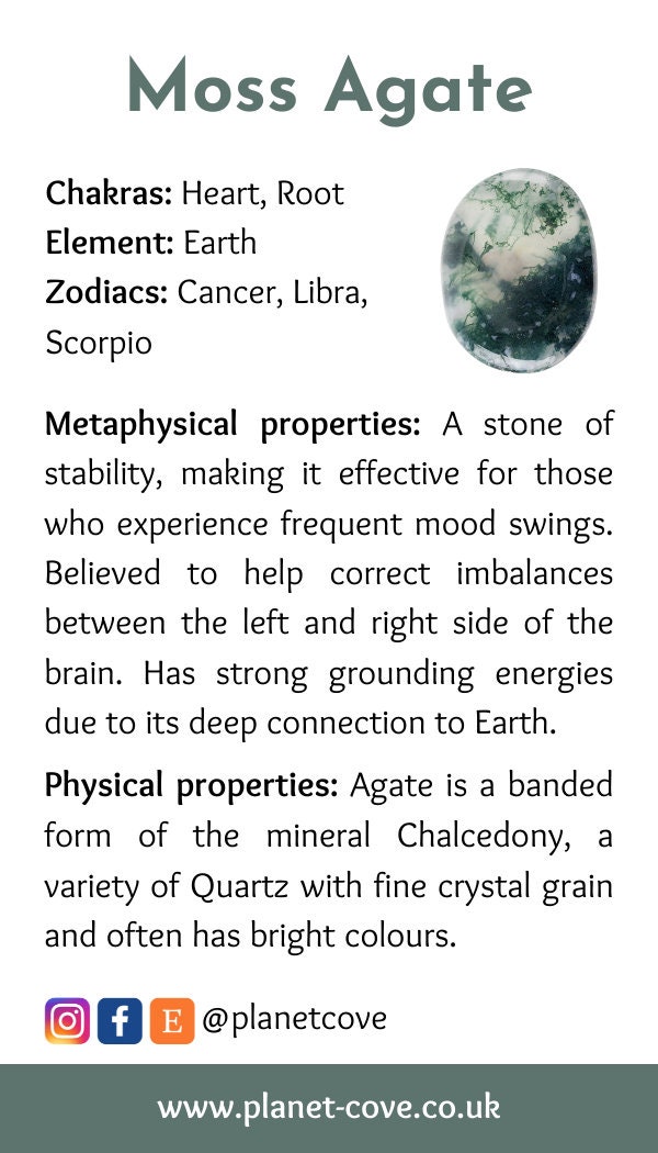 Moss Agate is said to be a stabilising stone, connected with nature. It is largely associated with the fourth or heart chakra, which represents love, empathy, and forgiveness.