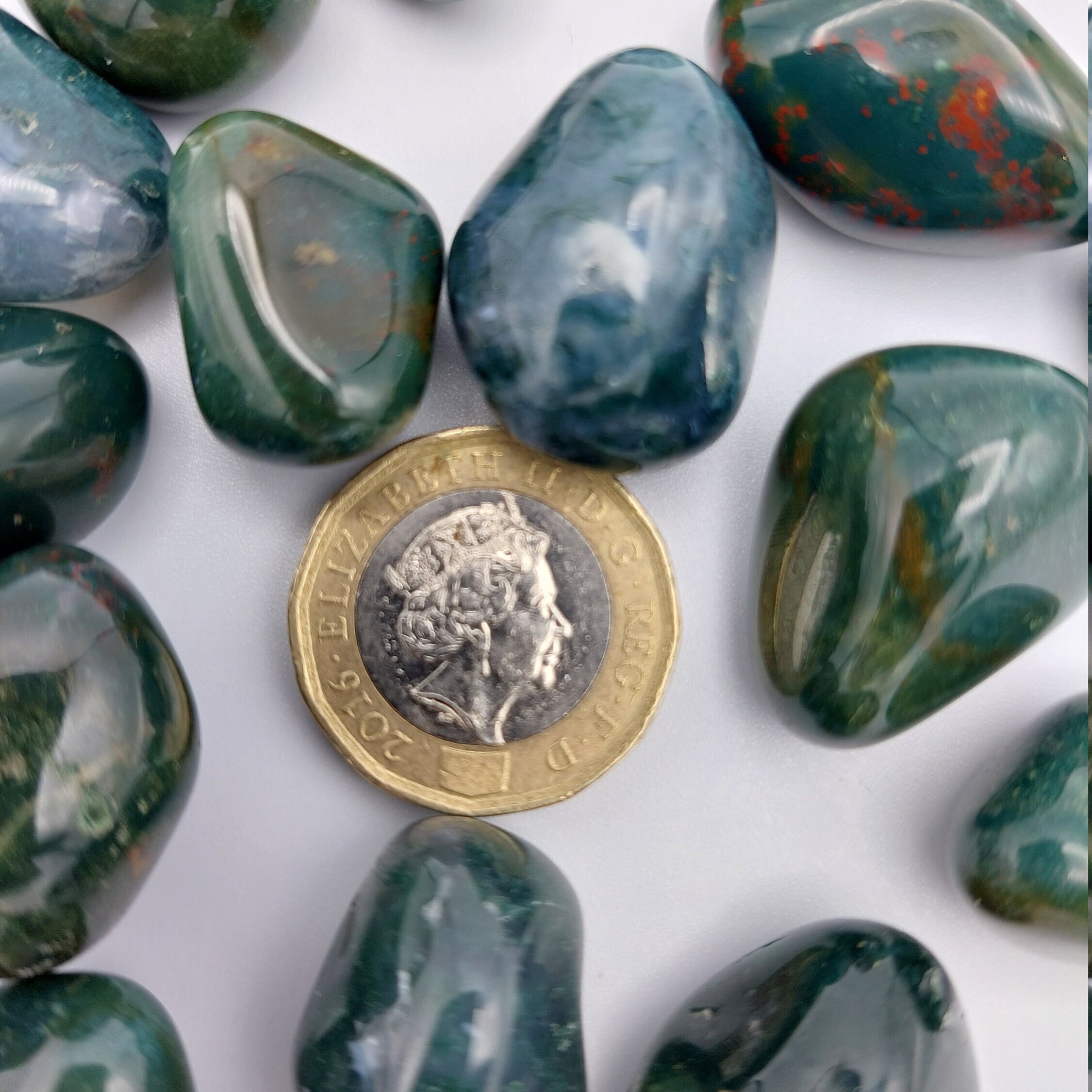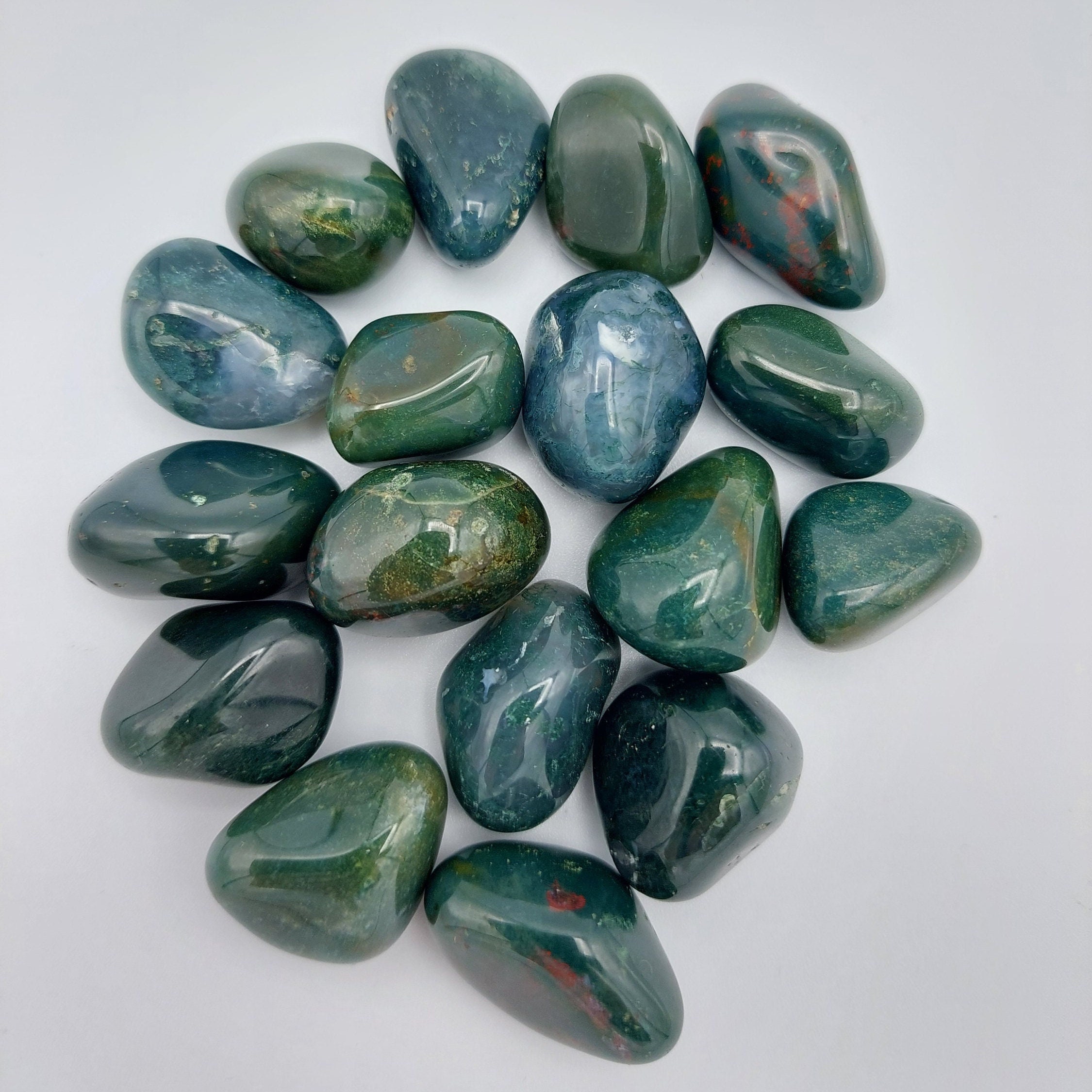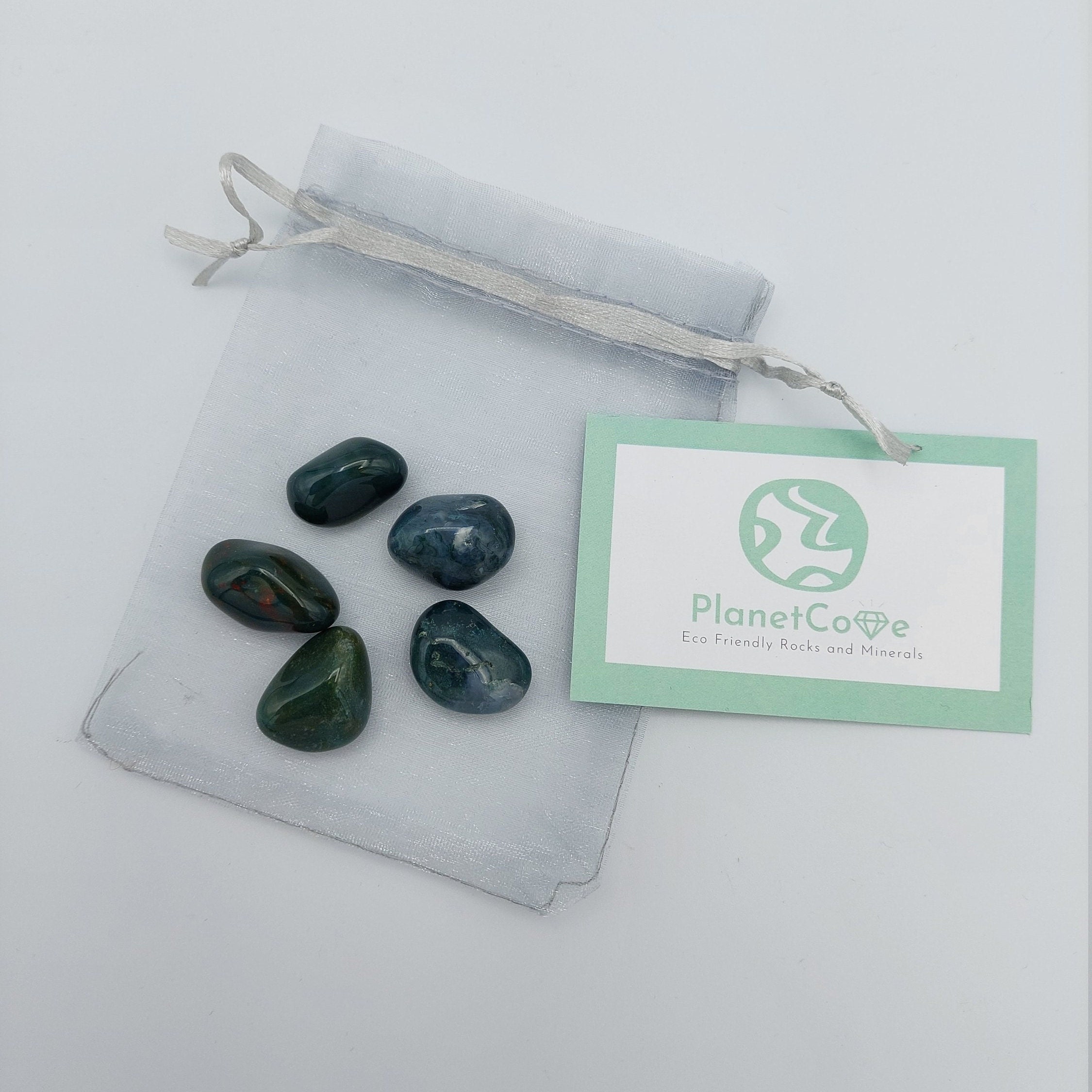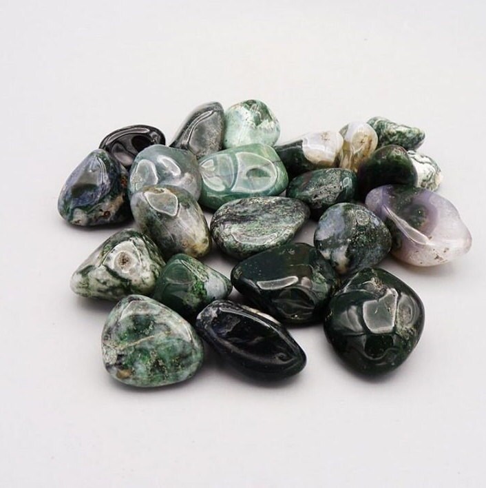 Buy either a set of five vintage Moss Agate tumblestones or a single generic stone. The vintage stones are slightly darker green in colour, with red inclusions. You will receive a random selection.