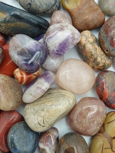 Tumblestones or "tumbled stones" are made by "tumbling" rough crystals, minerals or rocks in a rotating barrel with different grades of grit and polish, similar to the natural processes that produce “sea-glass”.