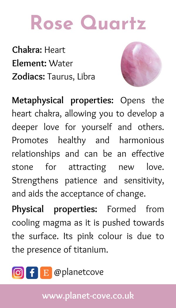 Rose quartz is formed from cooling magma in volcanoes as it is pushed towards the surface. Its pink colour is due to the presence of titanium. It has a hardness of 7 on the Mohs scale.