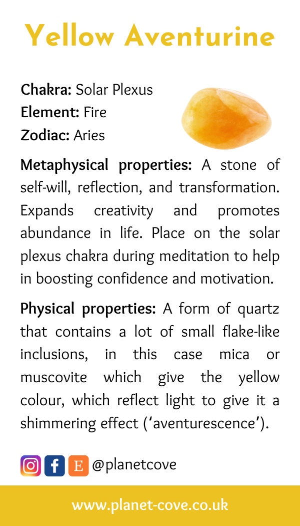 Yellow Aventurine is thought to enhance inner strength, creativity, balance, and motivation. It is known as a good stone for people who are hypersensitive and empathic. It is associated with focus, drive, inspiration and leadership qualities.