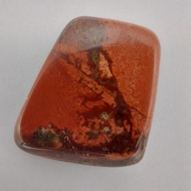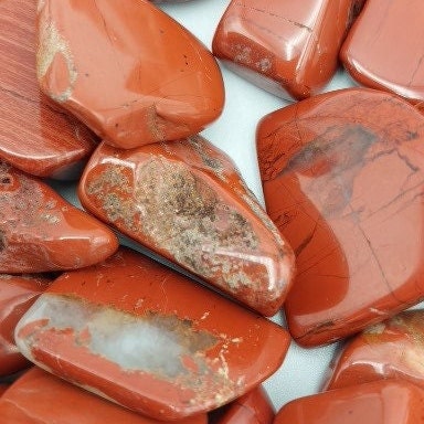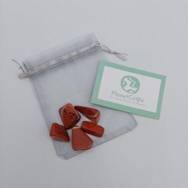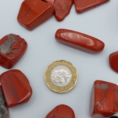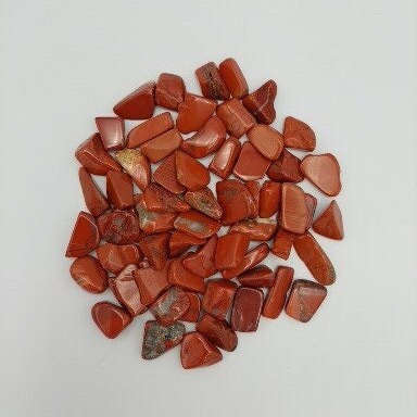 Buy either one or a set of five small (approx. 0.5 - 3 cm) Red Jasper tumblestones. Some of the stones are quite flat, irregular in shape and contain white or black inclusions. You will receive a variety of sizes and shapes at random.