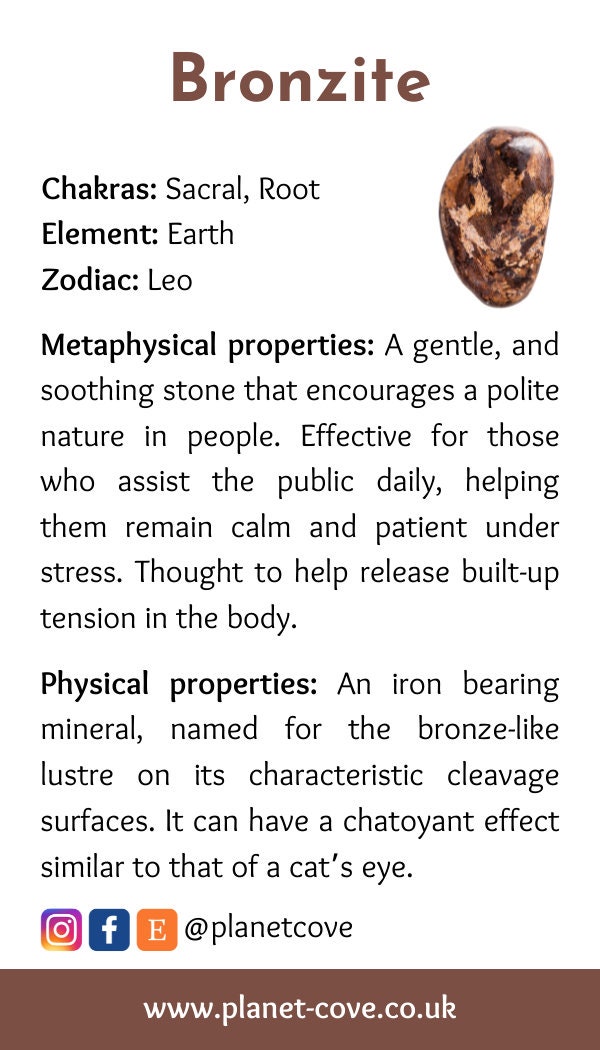 Bronzite is considered a grounding stone and is thought to install confidence and courage.
