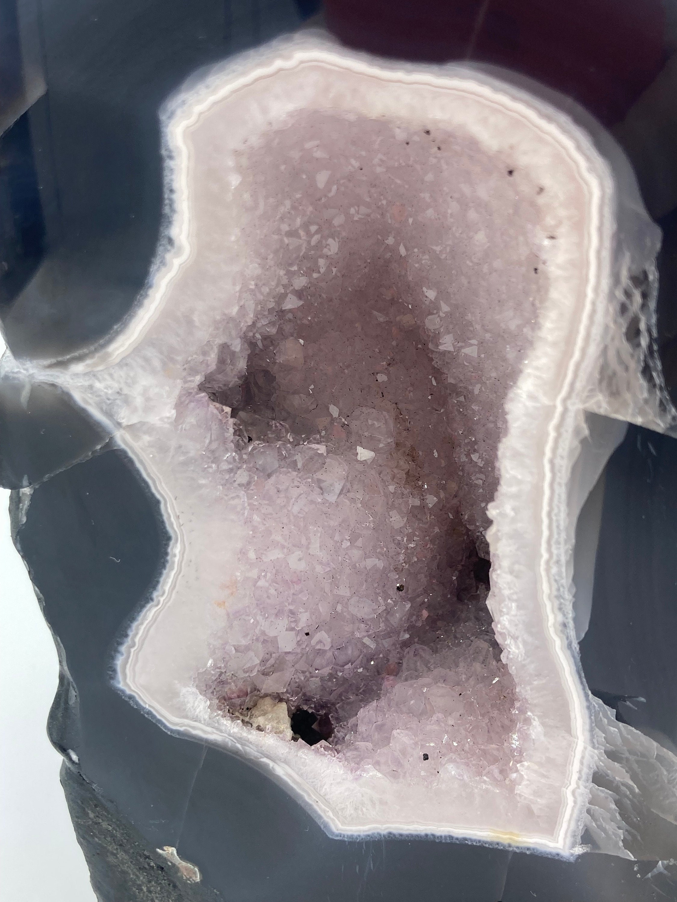 Please note that this sample does contain some tiny black specs. This is perfectly normal, they are iron oxide spots that started growing on the amethyst as it was forming. The iron simply mixed in with the primary composition of amethyst (silicon and oxygen) and the other elements that give it the purple colouring: aluminium, manganese, etc.