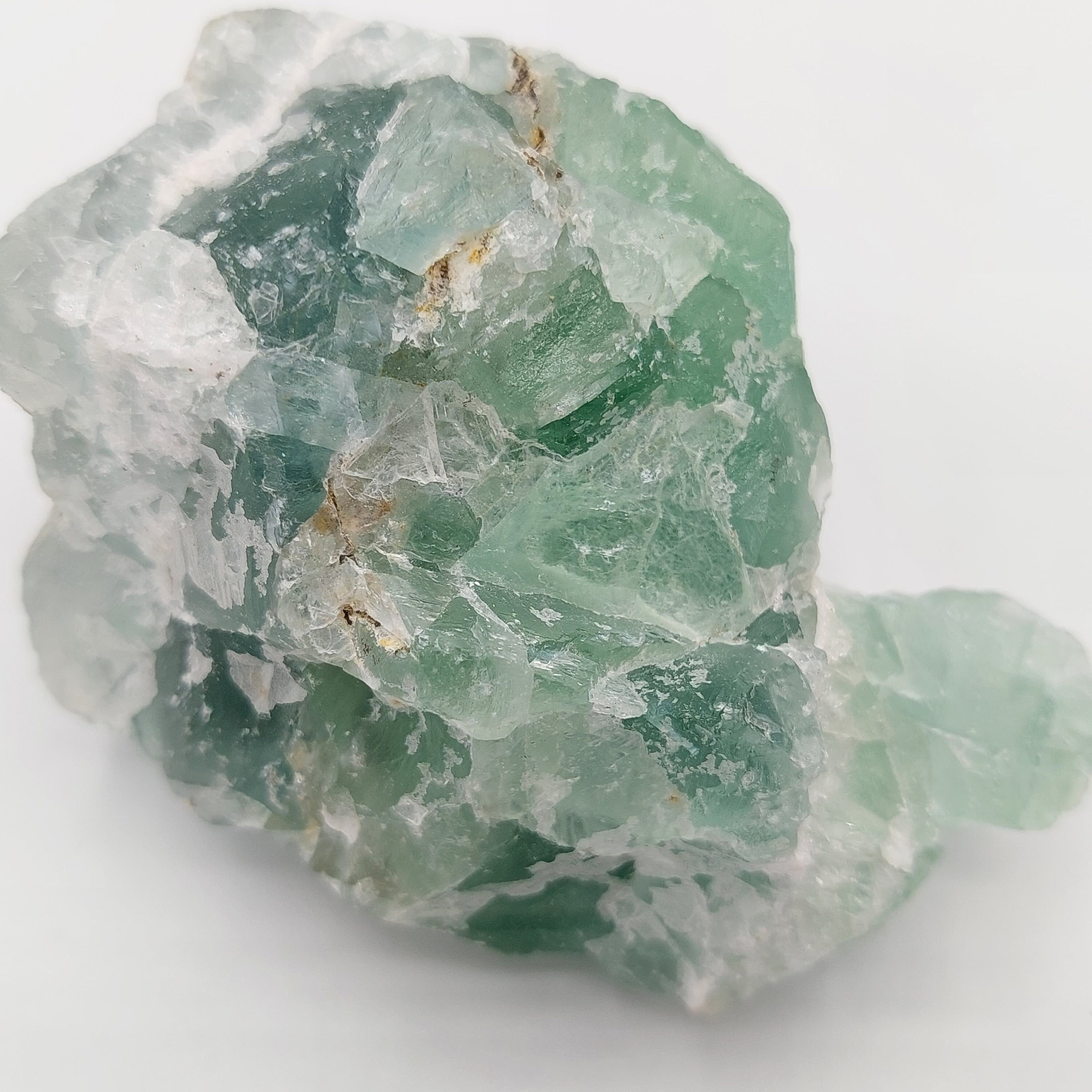 Fluorite is the mineral form of calcium fluoride (CaF₂). Pure fluorite is colourless and transparent, but impurities usually make it a colourful stone, often green or purple. A fluorescent mineral, meaning it glows with a form of luminescence when it absorbs UV light. It is a reference mineral for level 4 on the Mohs hardness scale.
