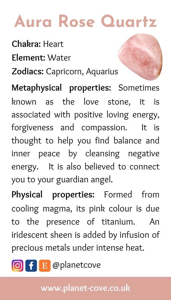 Aura Rose Quartz is sometimes known as the love stone as it is associated with positive loving energy, forgiveness and compassion. It is also thought to help cleanse your body, emotions, and environment by absorbing negative energy. Rose Aura Quartz is believed to connect you with your guardian angels, and to balance and stabilise emotions, calming and soothing you and helping you find inner peace and to recover from emotional trauma.