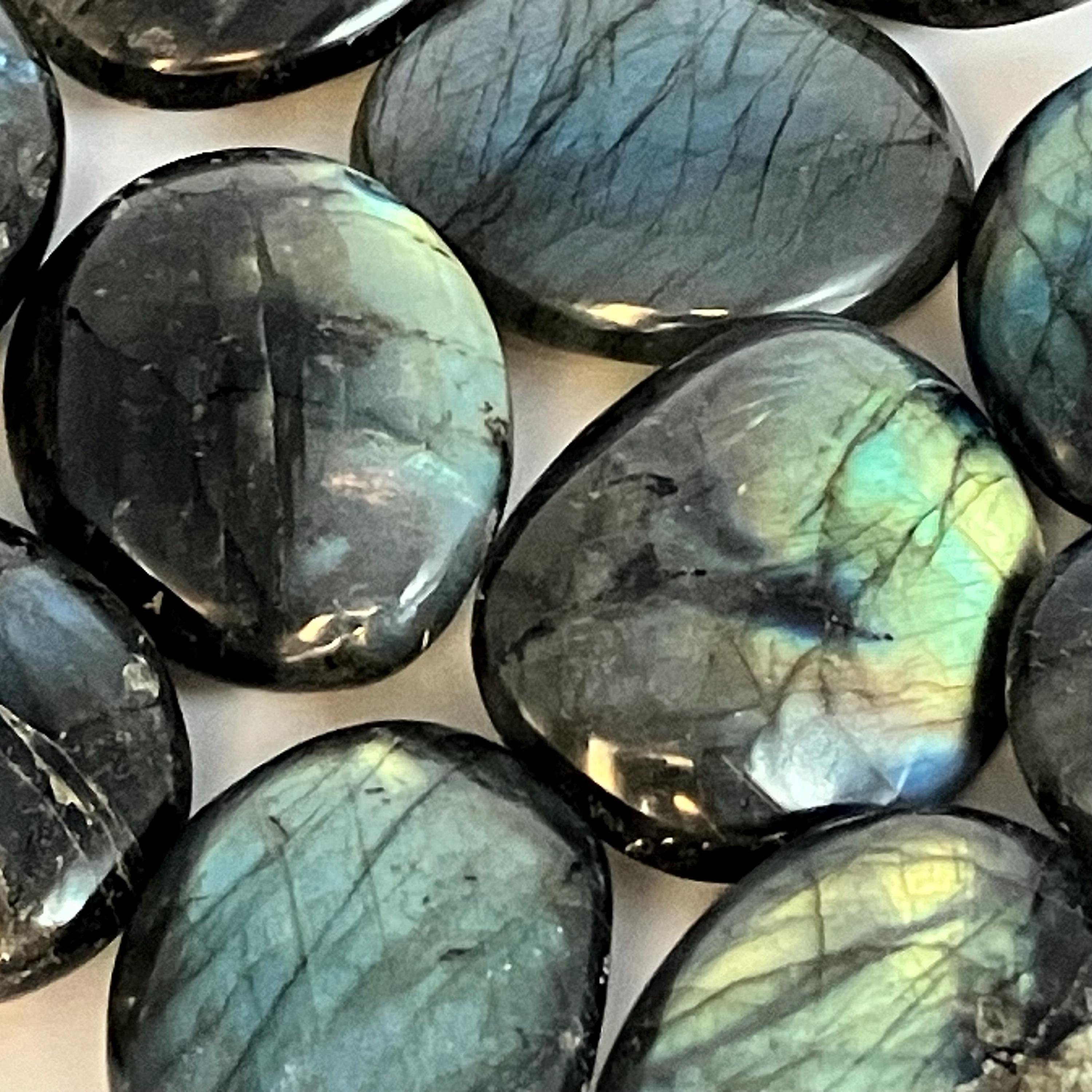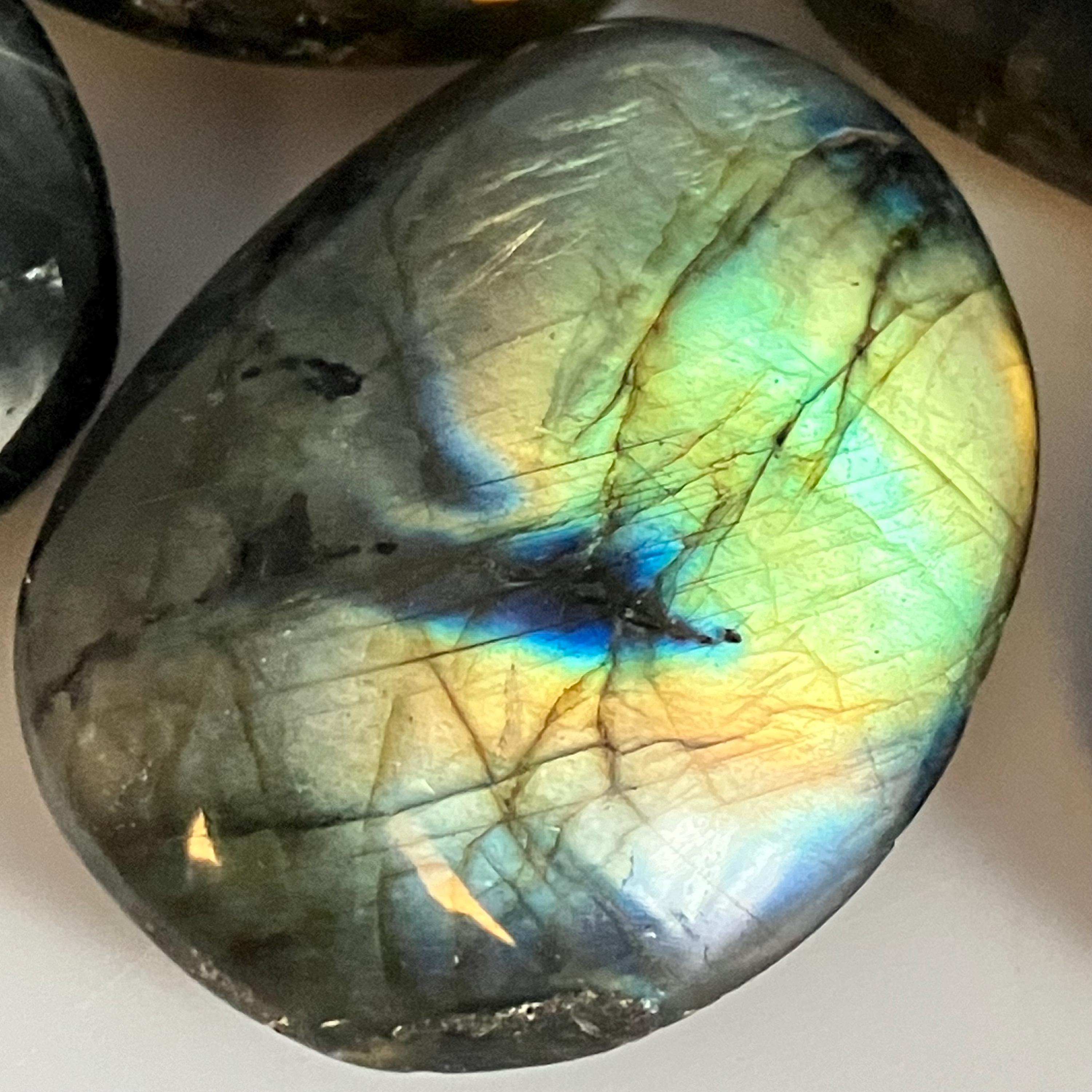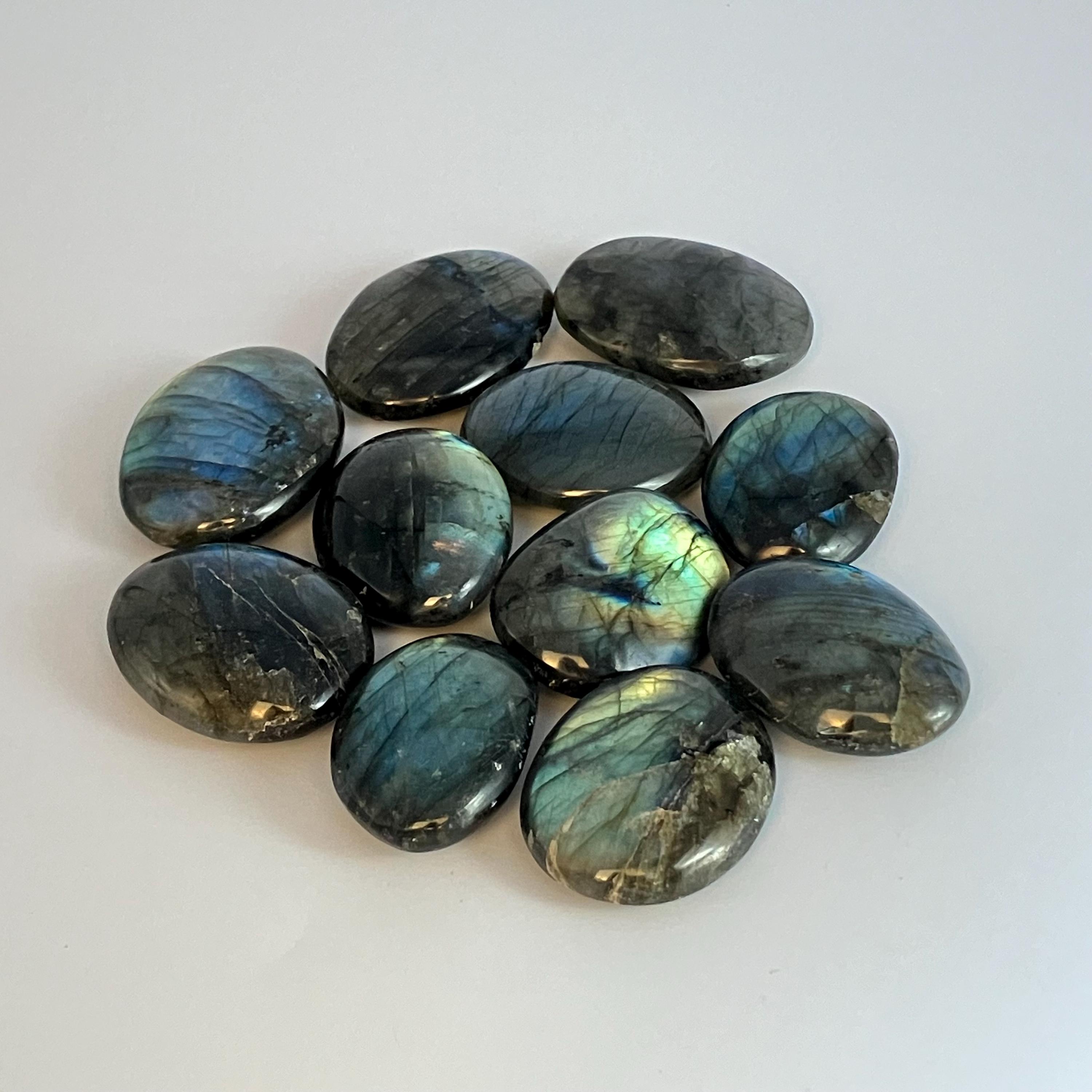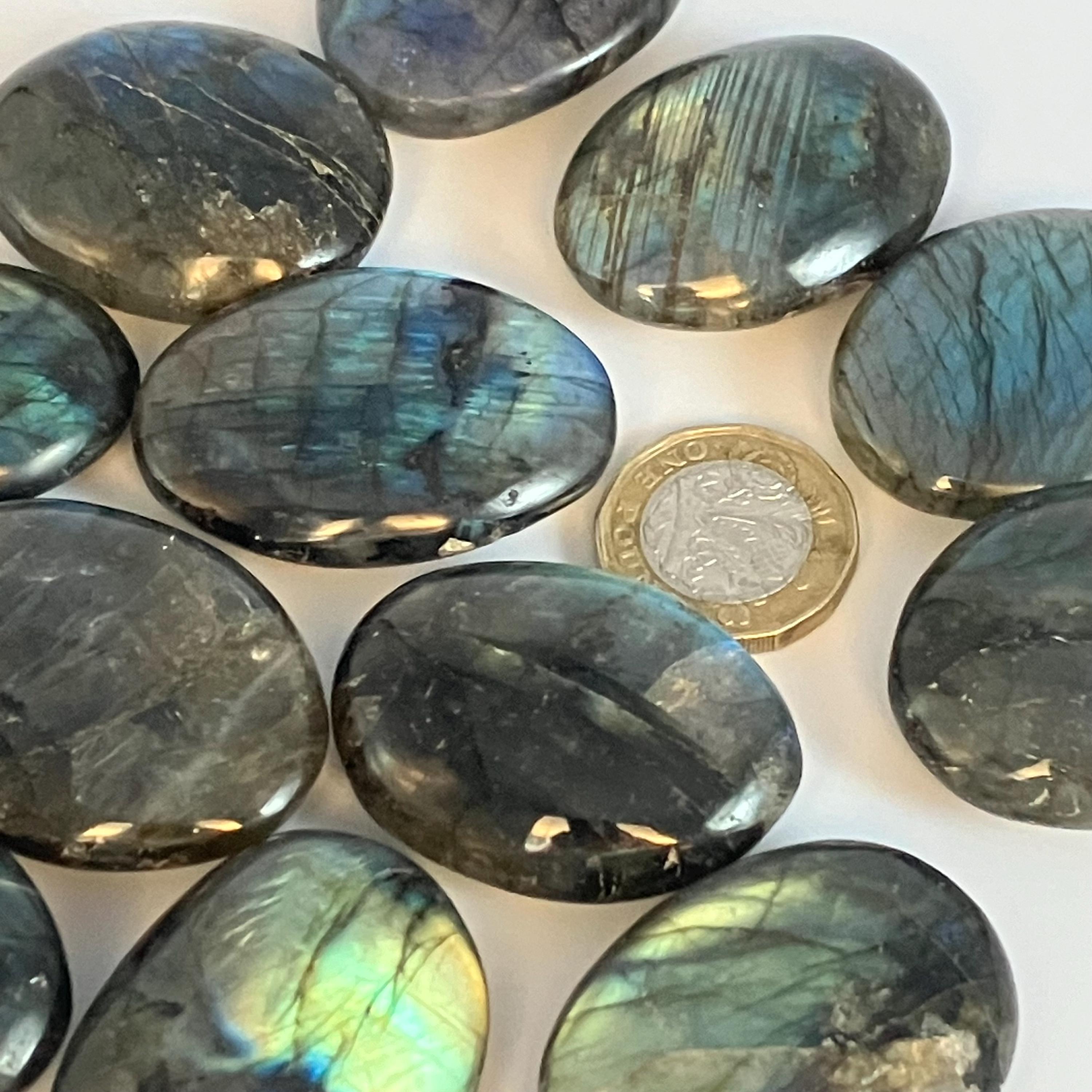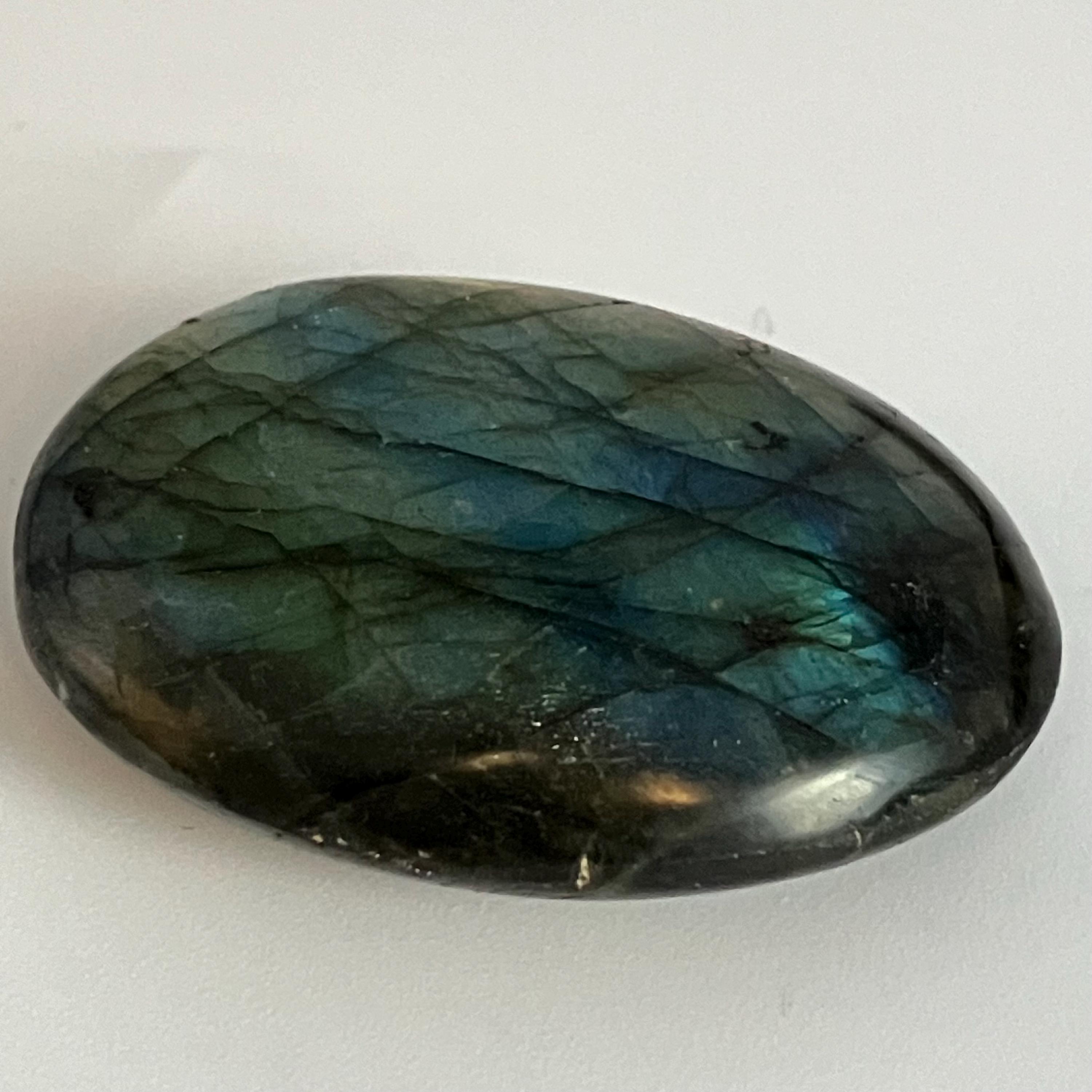 One medium (approx. 4x3cm) Labradorite palmstone. These are gorgeous stones with lots of blue and green flashes.